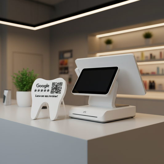 Stand pentru recenzii Google cu cod QR și NFC în formă de dinte