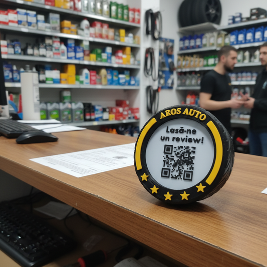 Stand cu cod QR pentru recenzii Google, cu NFC, model roată F1, diverse culori