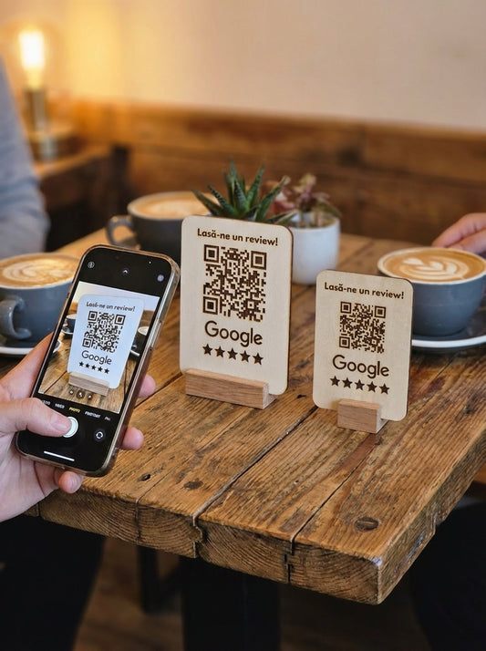 Stand din lemn cu cod QR pentru recenzii Google – personalizabil, cu suport elegant