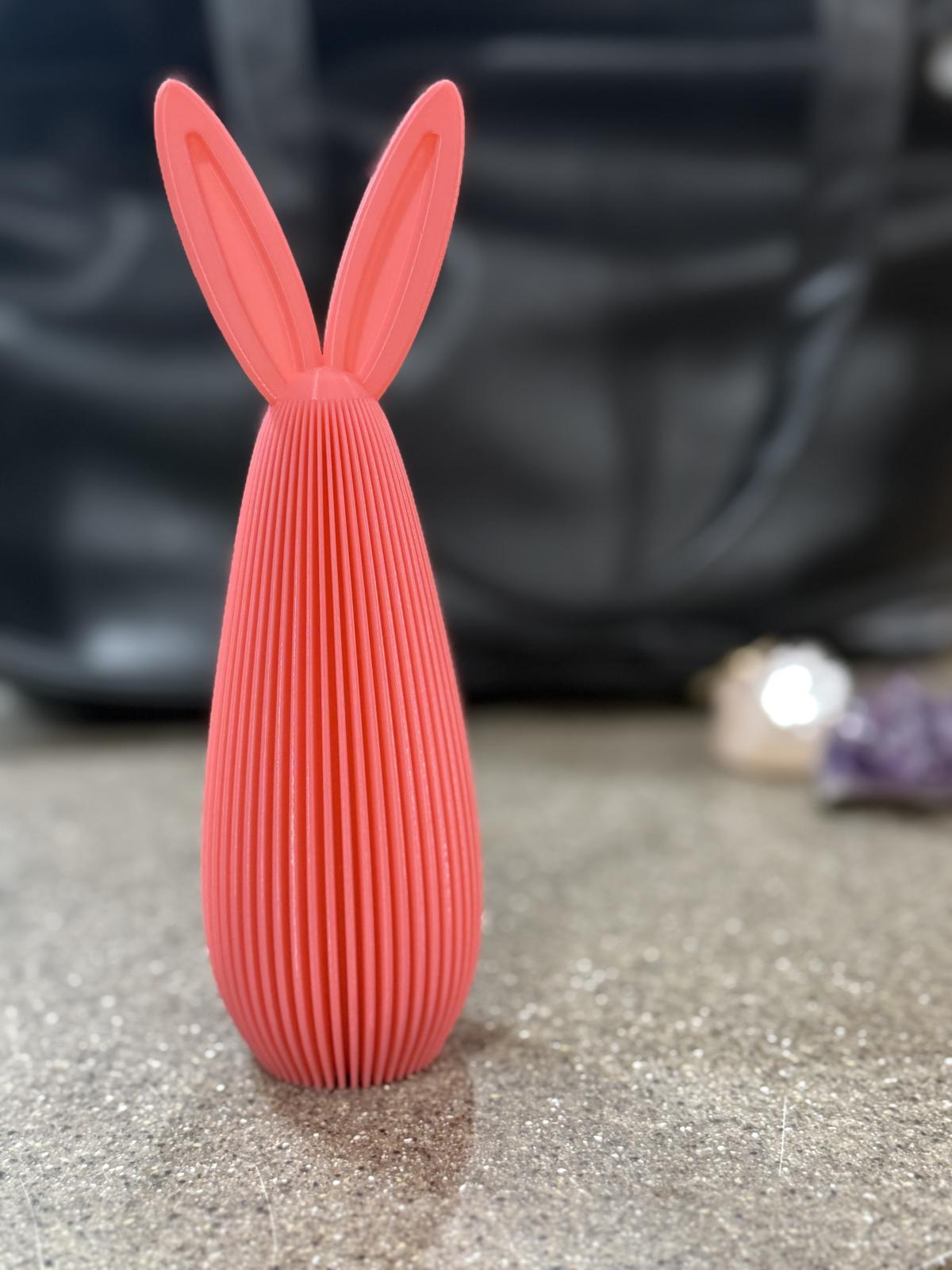 Iepuraș stilizat din plastic imprimat 3D, cu interior gol pentru a economisi filament