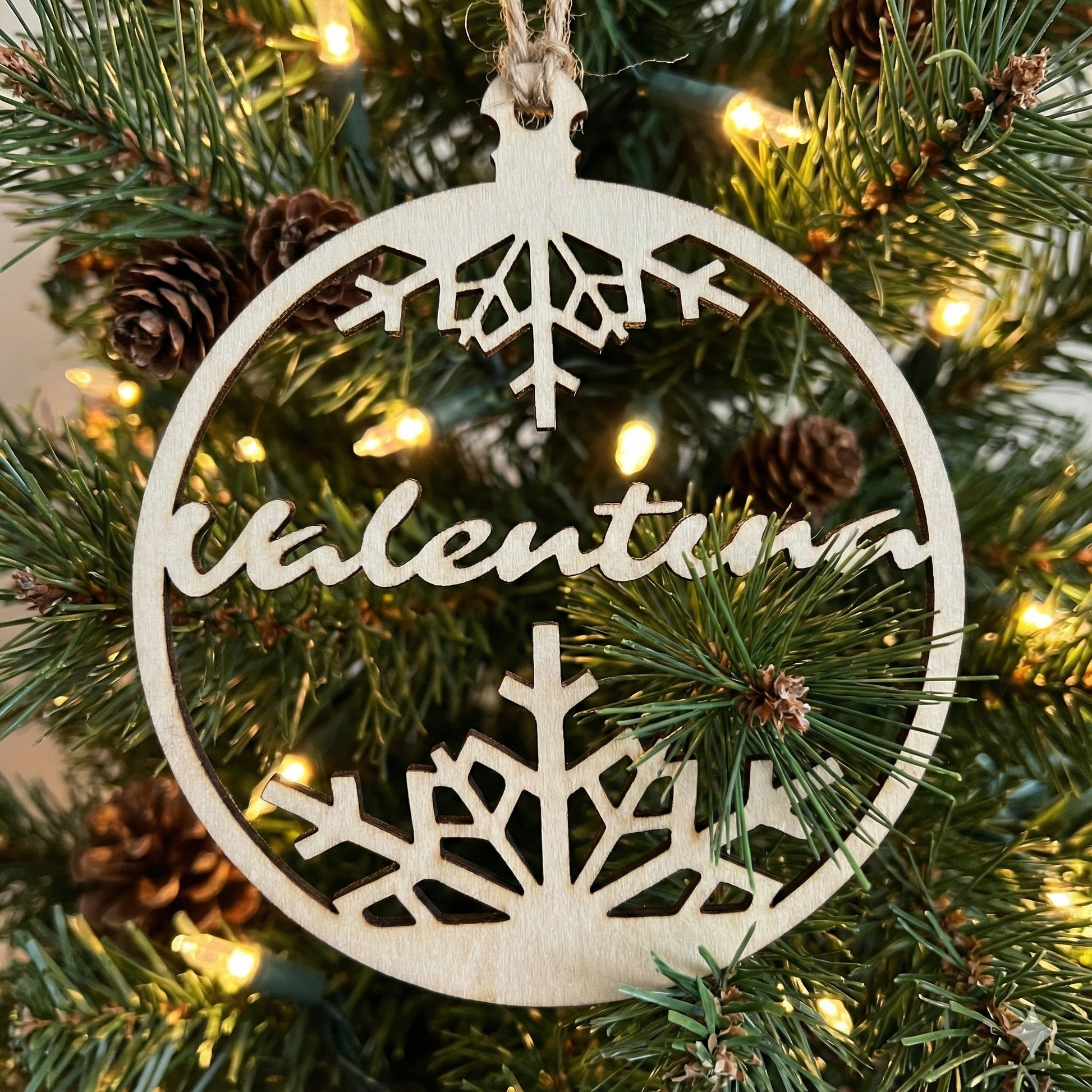 Oferă bradului tău un strop de magie personalizată! Aceste decorațiuni din lemn, gravate cu numele ales de tine, transformă orice sărbătoare într-o experiență caldă și unică pentru întreaga familie. Designul elegant cu fulgi de nea și materialul natural aduc o notă rafinată și autenticității atmosferei de Crăciun. 🎄